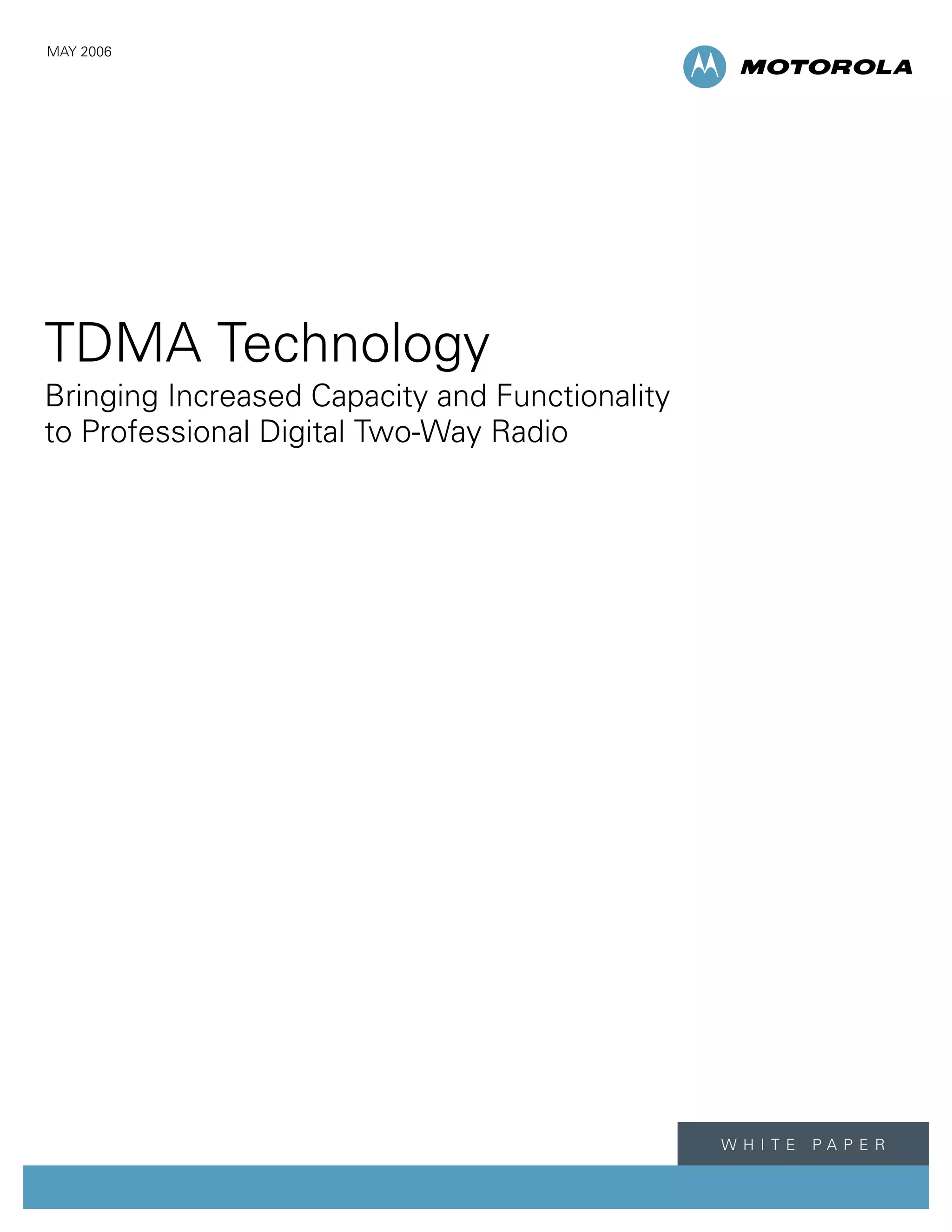 TDMA technology allows multiple users to access a single channel by dividing it into time slots. This increases spectral efficiency and channel capacity compared to analog systems. TDMA can integrate voice and data and provides better voice quality over greater ranges than analog. The document discusses how TDMA enables professional organizations to double their channel capacity to achieve 6.25 kHz efficiency, which will likely be a future regulatory requirement. It argues that two-slot 12.5 kHz TDMA is the best choice for professional mobile users due to its advantages in features, costs, battery life, and ability to further increase efficiency without interference.
