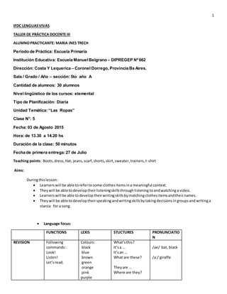 The document provides details about an English lesson for 5th grade students in Coronel Dorrego, Argentina. The 50-minute lesson focuses on clothing vocabulary and involves watching a video about animals wearing clothes. Students will practice describing what characters are wearing, develop writing skills by creating a song verse, and have homework matching clothing words. The natural approach method is used with pre-listening, while listening, and post-listening activities to reinforce vocabulary comprehension.