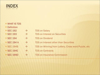 This document defines various sections under the Indian Income Tax Act that specify tax to be deducted at source (TDS) for different types of payments. It outlines TDS rates and thresholds for salary (Section 192), interest (Section 193, 194), dividends (Section 194), lottery winnings (Section 194B), contracts (Section 194C), rent (Section 194I), professional fees (Section 194J), and payments to non-residents (Section 195). It also discusses due dates for remitting TDS, interest charged on late payments, and penalties for non-compliance.