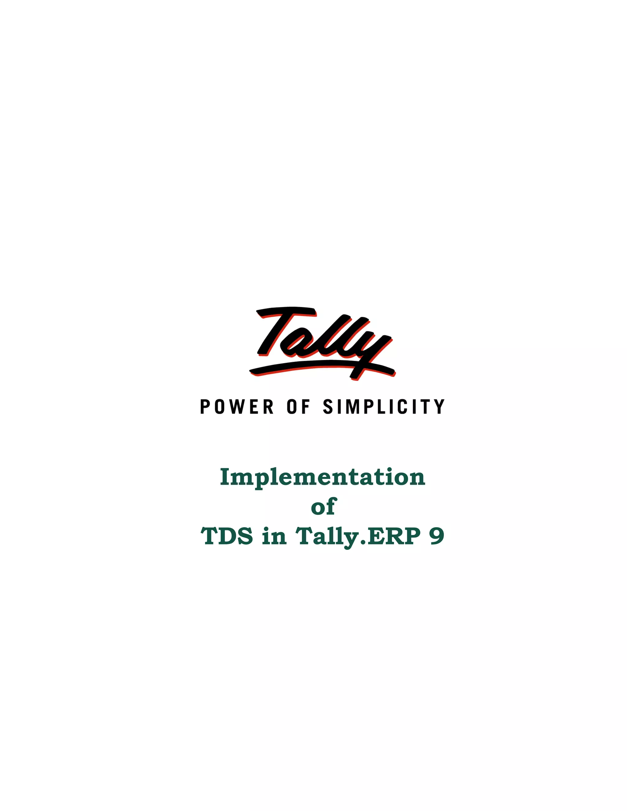 The document provides information about implementing TDS (tax deducted at source) functionality in Tally.ERP 9. It discusses the scope and applicability of TDS, the TDS process including payment and returns filing. It then describes the TDS features available in Tally.ERP 9 and provides step-by-step lessons on enabling TDS, performing TDS transactions for various scenarios, generating TDS reports, and filing e-returns.