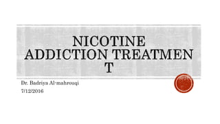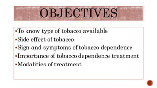 This document provides information on tobacco dependence treatment. It begins with objectives and an introduction noting the global impact of tobacco use. It then describes various types of tobacco products and their significant health side effects. Signs and symptoms of nicotine dependence are outlined using the Fagerstrom Test. The benefits of quitting and roles of medical staff in treatment are discussed. Treatment methods covered include counseling, nicotine replacement therapy, medications, and support groups. Nicotine withdrawal symptoms and specifics of nicotine patches, gum, and other replacement products are also summarized.