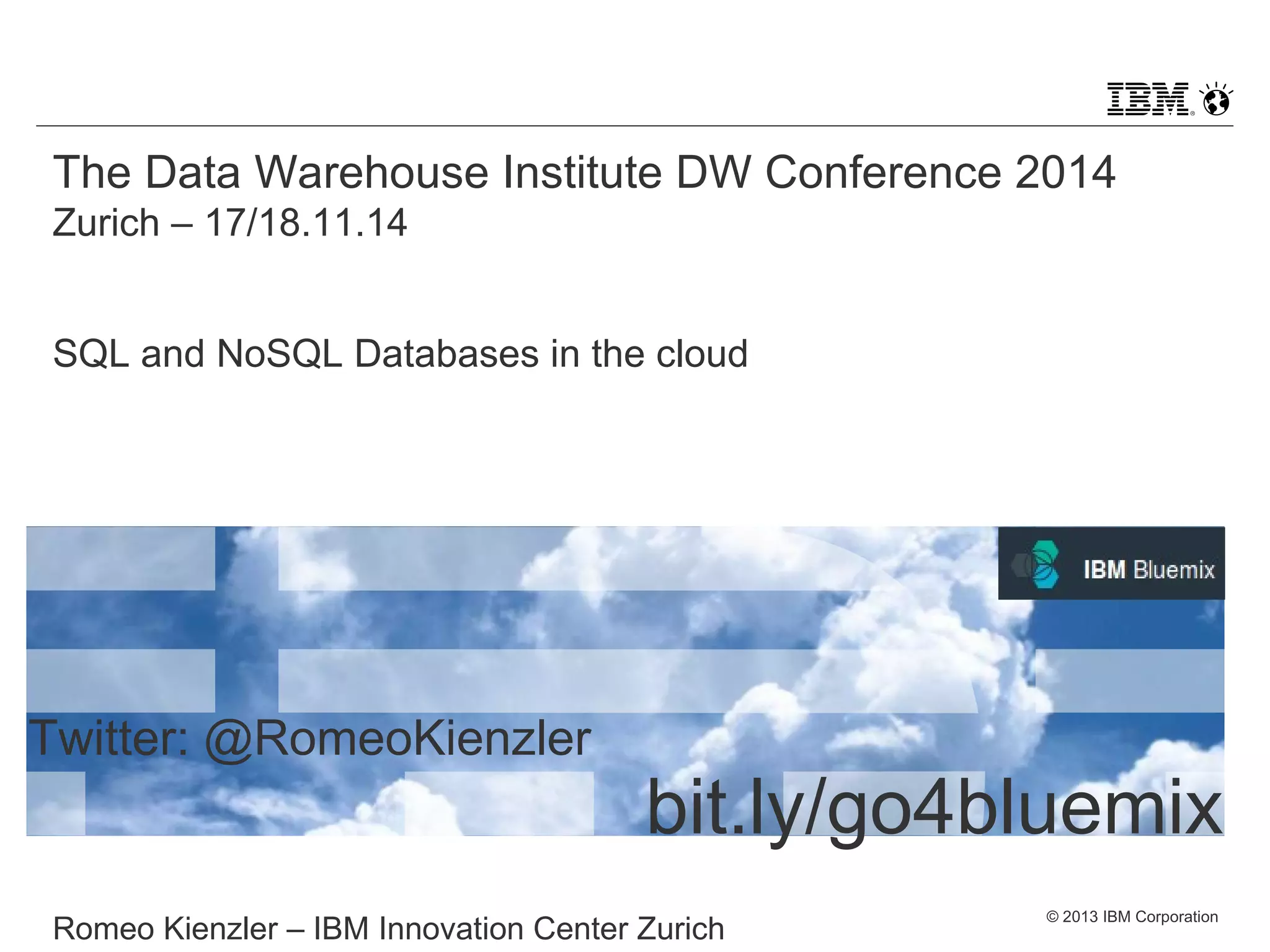The document discusses databases in the cloud, including SQL and NoSQL options. It introduces IBM Bluemix, a cloud platform that provides database services. The advantages of database-as-a-service include reduced overhead and risk compared to self-hosted databases. Examples of companies using Cloudant database services are given. Reasons for using cloud databases include elasticity of storage and computing power as well as automatic backups and maintenance.