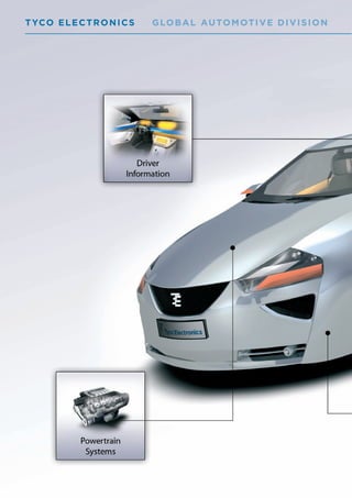 This document discusses Tyco Electronics' automotive products and services. It provides an overview of Tyco Electronics' global automotive division and their portfolio of electronic components used in automotive applications. This includes connector systems, relays, sensors, fiber optic products, wire and cable. The document also describes Tyco Electronics' online resources and product literature available to customers.