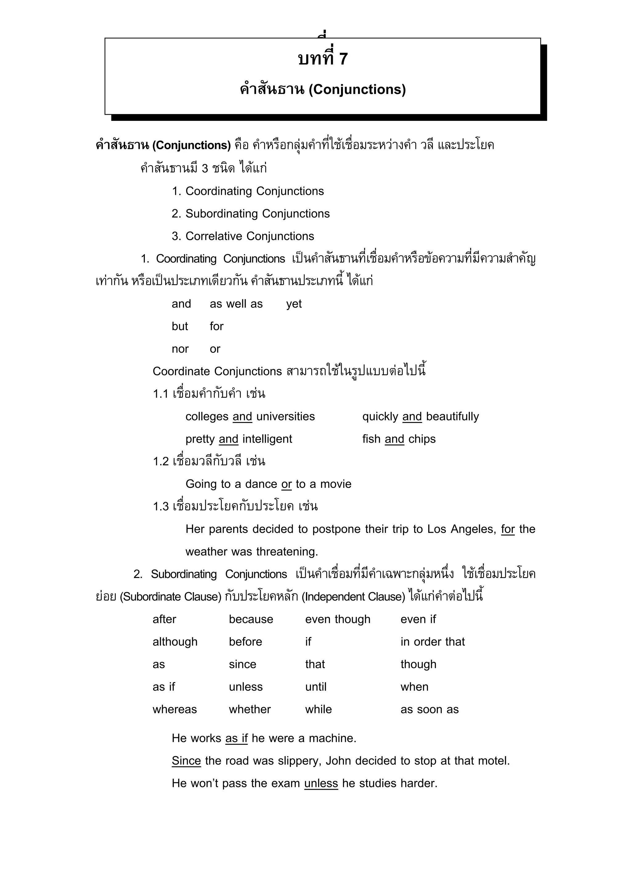 1. Coordinating Conjunctions เปนคําสันธานที่เชื่อมคําหรือขอความที่มีความสําคัญ