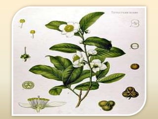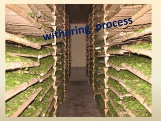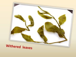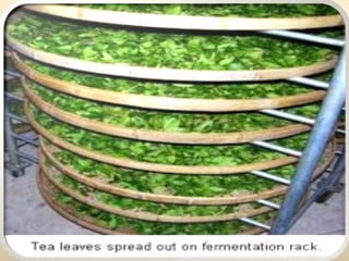 The document summarizes information about tea plants and the process of manufacturing tea. It discusses that tea comes from the Camellia sinensis plant and describes the two main varieties, China and Assam. It then outlines the steps involved in manufacturing tea, including withering, rolling, fermentation, drying, and grading. Key steps are withering to reduce moisture, rolling to break plant cells and allow enzymatic reactions, and fermentation to produce the colors and flavors characteristic of tea.