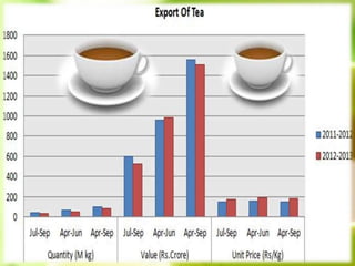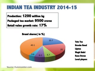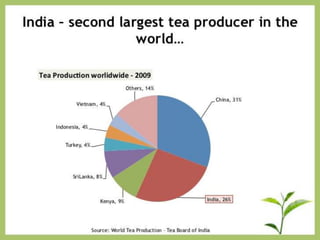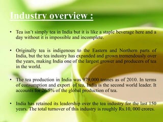 The document provides an overview of the tea industry in India, highlighting its significance as a staple beverage and the growth of production and consumption over the years. India is the second-largest tea producer globally, accounting for 25% of the total production, with major brands like Tata Tea and Brooke Bond dominating the market. The tea sector is labor-intensive, employing over 1.1 million workers, and has diversified into various types, including green and herbal teas to meet changing consumer preferences.