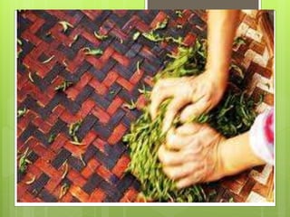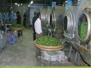 Tea processing transforms freshly plucked tea leaves into dried leaves for brewing tea. There are six main types of tea which are the result of differences in processing, not the plant itself. The basic steps are plucking leaves, withering to remove moisture, disruption to promote oxidation, oxidation to change color and flavor, fixing to stop oxidation, shaping, and drying. Oxidation levels determine the tea type from no oxidation in green tea to full oxidation in black tea. Fermentation through microbial activity is also important for puerh and black teas.