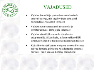 Teised asulad jategevused vallas ja regioonis Külaliikumine: Isereguleeruv kogukond Kohalike vajaduste uuring Ühised eesmärgid ja plaanid Ühine identiteet Loodud võrgustikud Ühiskonna teised võrgustikud Uuring Koolitus Rahvusvahelisus Küla elanikud; koostöö,ühised võrgustikud, perekonnad, koolid, raamatukogud,seltsid, ettevõtjad; teabetuba kui sõlmpunkt ja kiirendi