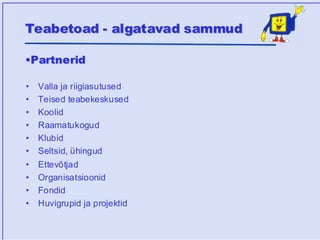 Teabetoad on mõjusvahend kodanikuühiskonna tugevdamisel Teletubade Euroopa ühenduse töötuba Budaörsis 22-25.05 2008 Vestlusringis Leedu, Eesti, Moldaavia Ungari, India jt riikide esindajad