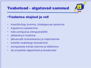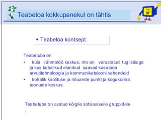 Tegurid avatus kogukonnalejuhendamine grupitöö koht pakub vahendeid ja keskkonda õppimiseks ja tööks, tugevdab isiklikku ja sotsiaalset valmisolekut