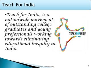 Teach For India recruits outstanding college graduates and professionals to teach for two years in low-income schools. It aims to eliminate educational inequity in India. Founded in 2008 based on the Teach For America model, it initially placed fellows in Pune and Mumbai and has since expanded to 5 cities. Over 50% of Indian children do not complete primary school. Teach For India is part of the global Teach For All network working to expand educational opportunity around the world.