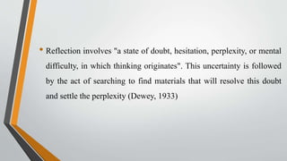 This document discusses reflective practice for teachers. It defines reflection as thinking about one's experiences to learn from them. It outlines several models of reflection, including Dewey's stages of reflection, Schon's model of reflection-in-action and reflection-on-action, and Kolb's learning cycle. Various strategies for teacher reflection are provided, such as reflective journals, peer observation, video recording lessons, and action research. The purpose of reflection is to help teachers improve their practice and enhance student learning through critical analysis of their experiences.