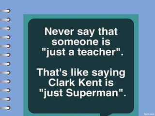This document discusses teachers as role models. It states that role models inspire and encourage striving for greatness and potential. Teachers are especially important role models after parents. Good teachers inspire students to learn through their teaching style and interaction. They motivate and encourage students through praise, recognition, involvement, and incentives. The teacher's entire personality reflects on students' minds, so every teacher must have a good personality with pleasing appearance, manners, enthusiasm, initiative, open-mindedness, and professional ethics.