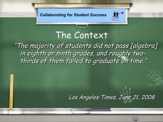 The document discusses teacher collaboration strategies and outcomes. It describes a program called SITTE that used teacher collaboration to improve student outcomes in algebra. Through collaborative lesson planning, examining student work, and focusing on teaching tools rather than topics, SITTE helped teachers develop students' basic skills in meaningful ways. As a result, students scored higher on assessments and passage rates for algebra increased. The document also discusses facilitating teacher collaboration through professional development programs, common planning periods, and overcoming barriers like time constraints.