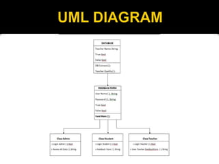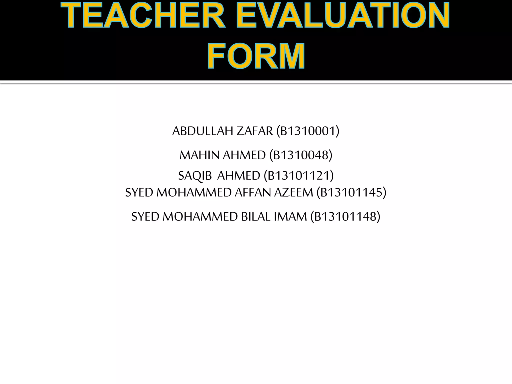 The document outlines a software project for a Teacher Evaluation Form that assesses teachers' performance based on student feedback, using a secure, iterative development model. The software features a user interface with individual student accounts, a database for storing evaluations, and a notification system for teachers with low ratings. Additionally, the project includes details on the implementation phases, testing procedures, and examples of evaluation criteria used in the assessments.