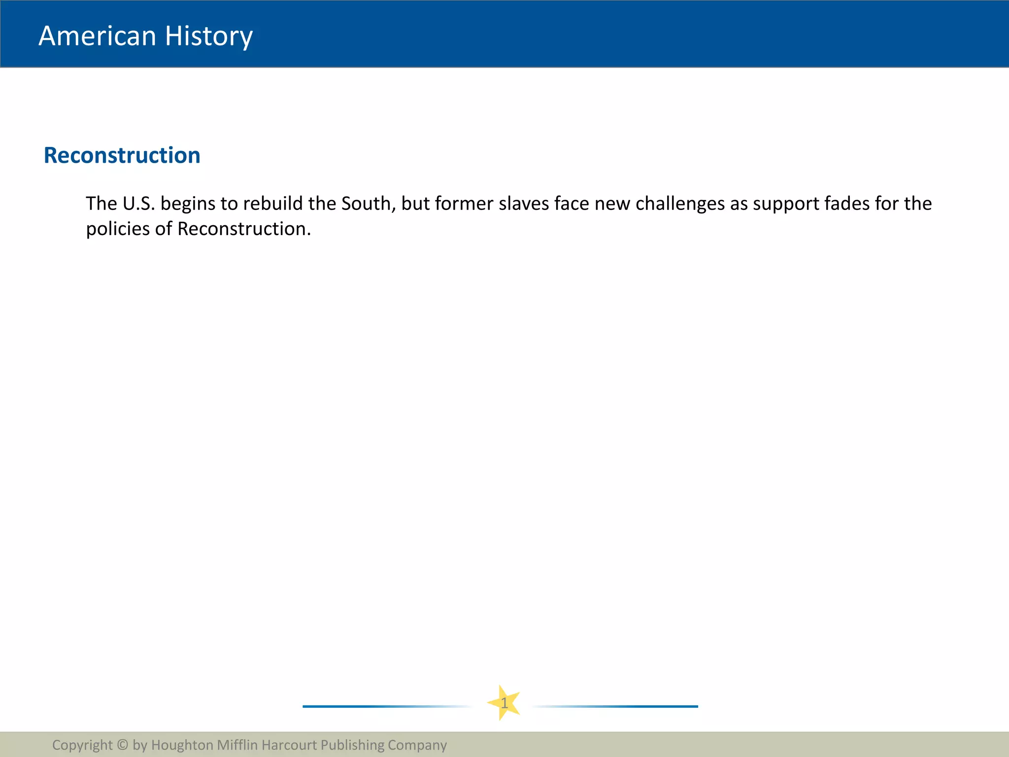 This document provides an overview of Reconstruction in the United States after the Civil War. It discusses Lincoln and Johnson's plans for reconstructing the South, but Congress opposed these plans and implemented its own Reconstruction policies. It then describes the establishment of new Republican governments in the southern states, challenges faced by freed slaves, economic changes, and the eventual collapse of Congressional Reconstruction due to rising opposition in the South and changing priorities in the North.