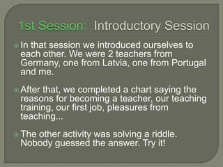 1. The introductory session where teachers introduced themselves and completed a chart about their teaching experiences. They also tried to solve a riddle about the number of steps a walking couple would take.