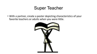 This document outlines topics and activities for teacher self-reflection on social-emotional development and interactions with children. It includes reviewing concepts like multiple intelligences, emotional intelligence, temperament, and goodness-of-fit. Teachers are prompted to examine their own early experiences and relationships, strengths and areas for growth, and philosophies around social-emotional learning and classroom environment. Discussion topics cover stress management, respectful relationships, and providing supportive learning environments.