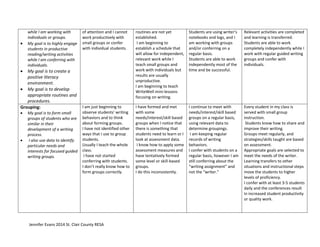 This document contains a teacher's self-reflection on implementing a writing workshop curriculum. It evaluates her progress on tasks related to preparing materials, managing the classroom, forming student groups, delivering lessons, and teaching strategies. For most tasks, the teacher has made progress from just beginning to understand concepts to fully implementing components of the writing workshop with fidelity and achieving high levels of student success.