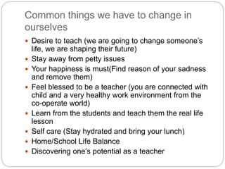 This document outlines common things teachers need to change in themselves and their students, as well as their approach and methods for enhancing learning. For teachers, it recommends having a desire to teach, staying happy and balanced, feeling blessed to teach, learning from students, and self-care. For students, it suggests giving them freedom and teaching them right from wrong. It advocates differentiation, inclusion, storytelling, understanding emotions, developing critical thinking, creativity, communication and collaboration skills in students. Various teaching methods are listed, like using humor, role playing, preparing well and being patient, compassionate and encouraging of students.