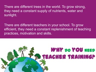 The document emphasizes the importance of continuous teacher training and support to ensure effective teaching, likening teachers to trees that need nourishment. It highlights the programs offered by Inspire Education, founded by experienced educators, to enhance teaching practices and skills. The document reports high participant satisfaction and recommendation rates for their training programs.