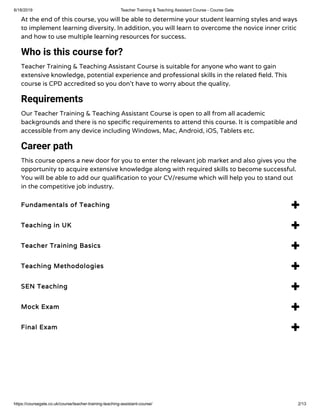 The Teacher Training & Teaching Assistant Course is designed to equip participants with essential skills and knowledge to support teachers and students effectively. It covers key aspects such as student learning styles, interactive teaching methods, and classroom management, and is suitable for individuals from all academic backgrounds. Completion of the course provides a CPD accredited qualification that enhances career prospects in the education field.