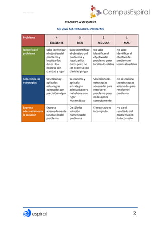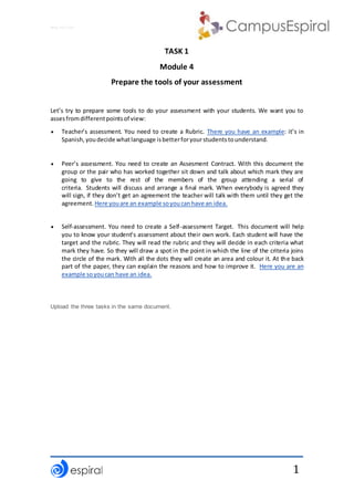 This document provides examples of tools for assessing student work: a rubric for teacher assessment, an assessment contract for peer assessment, and a self-assessment target for student self-assessment. The teacher's rubric includes criteria for identifying the problem, selecting strategies, and expressing the solution, each rated on a scale from excellent to poor. The peer assessment contract allows students to assign points and sign off to evaluate partners. The self-assessment target is a circle graph where students mark their performance on different criteria and explain areas for improvement.