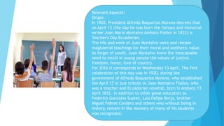 Teacher's Day in Ecuador is celebrated annually on April 13th in honor of Juan Montalvo, an Ecuadorian novelist and teacher born on that date in 1832. The day was established in 1920 by President Alfredo Baquerizo Moreno to pay tribute to Montalvo and other great educators in Ecuador's history. Some suggested activities for students to show appreciation for their teachers on this day include making posters, videos, crafts, cards, or collages with memories and messages of gratitude. Teacher's Day is also celebrated in Spain on November 27th in honor of Saint José de Calasanz, a priest and founder of the first popular Christian school in Europe.