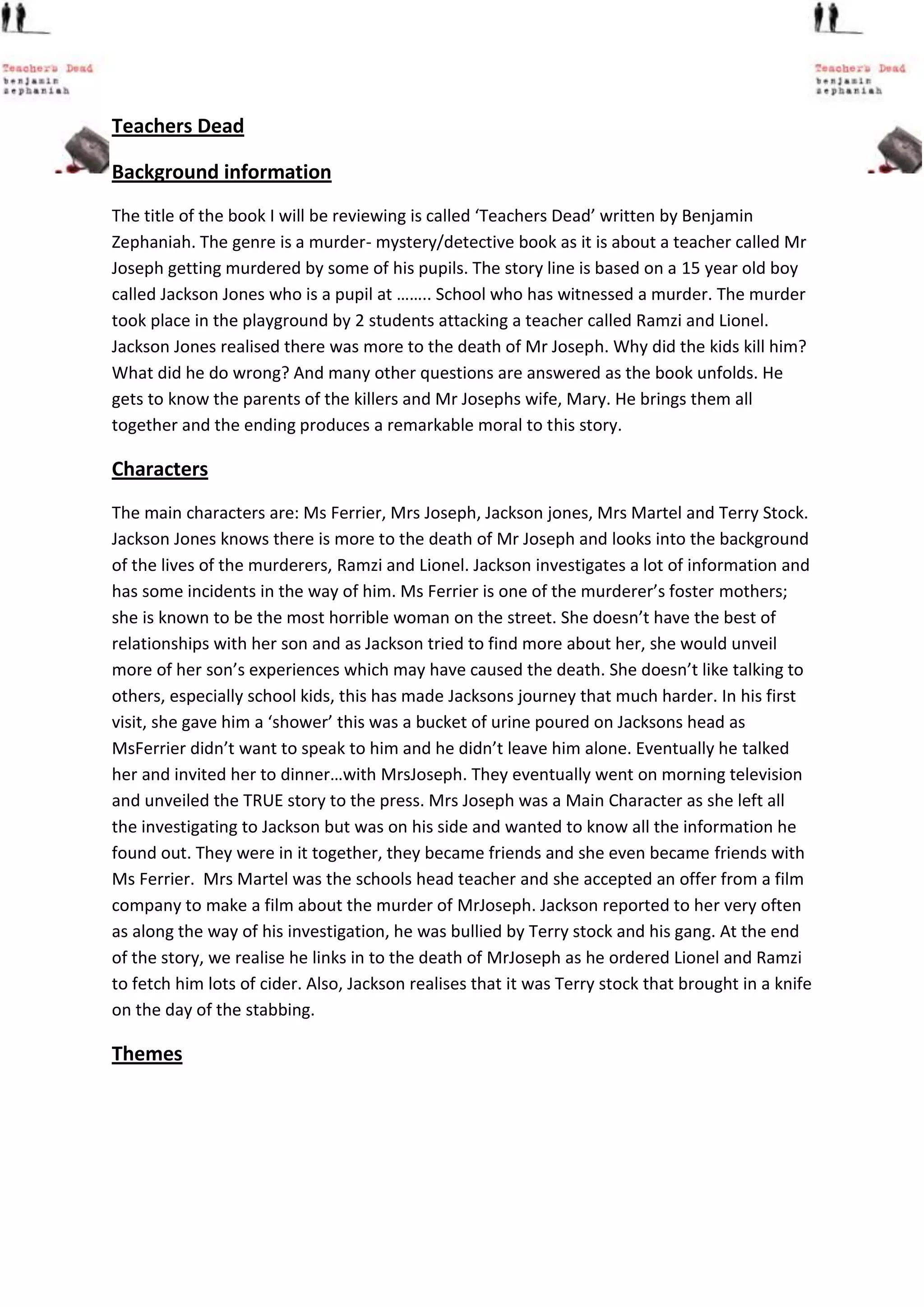 Jackson Jones witnesses the murder of his teacher Mr. Joseph in the school playground. He suspects there is more to the story and investigates the backgrounds of the two students, Ramzi and Lionel, who committed the murder. Through his investigation, Jackson interviews Ramzi's foster mother Ms. Ferrier and discovers Ramzi experienced abuse, which may have contributed to the murder. Jackson also uncovers that another student, Terry Stock, had pressured Ramzi and Lionel into fetching him alcohol and had brought the knife used in the stabbing. In the end, Jackson is able to reveal the full story of Mr. Joseph's murder.