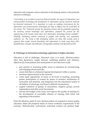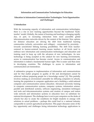 This document discusses the opportunities and challenges of using information and communication technologies (ICT) in education, particularly in developing countries like Ethiopia. It notes that while ICT provides new opportunities for distance learning and access to information, developing countries face challenges in infrastructure access and adapting traditional education systems. The key opportunities for ICT include computer-assisted learning, internet/intranet access, education management systems, and supporting distance/lifelong learning. However, simply incorporating new technologies may not be enough without also changing attitudes and preparing institutions for a knowledge-based society.