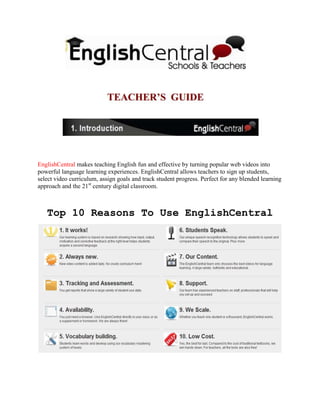 The document is a comprehensive teacher's guide for using the EnglishCentral platform, which enables teachers to create classes, assign video curriculum, and track student progress through a variety of tools. It outlines the registration process for both teachers and students, curriculum creation, goal-setting, and student enrollment, emphasizing the platform's features such as mobile accessibility and progress tracking. Additionally, it provides details on managing students, utilizing the reporting features, and accessing premium content for enhanced learning experiences.