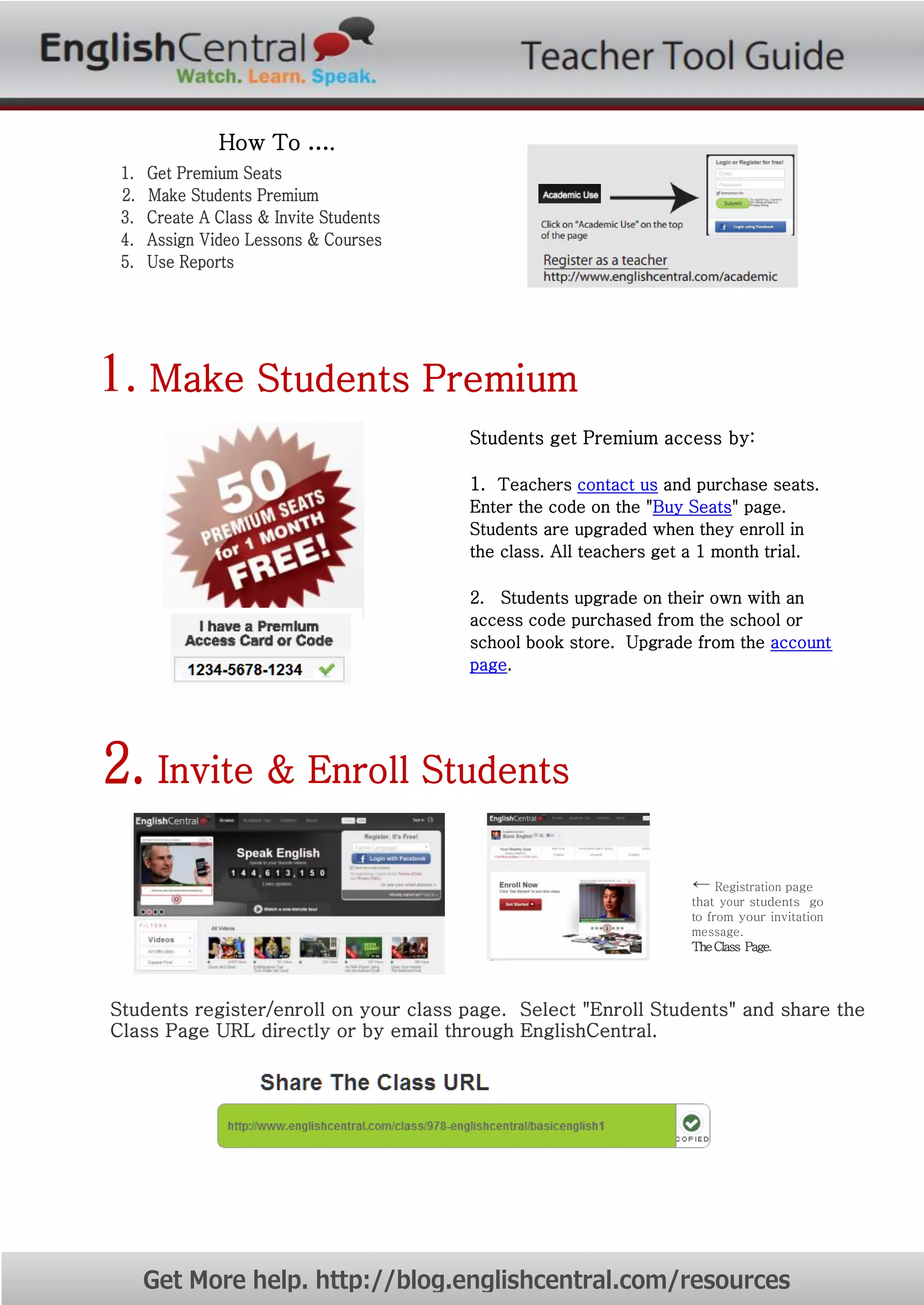 The document outlines how to use the EnglishCentral Teacher Tool to create classes, enroll students, assign video lessons and courses, and monitor student progress through reports. Teachers can make students premium, invite students to enroll in classes, set curriculum goals and select videos/courses, and then track watching, speaking, learning and course completion data for each student. The reports feature allows teachers to easily check student activities and progress over specific time periods.