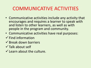 The document outlines a workshop on developing effective communicative tasks for teachers, focusing on enhancing communication skills through interactive activities. Participants, primarily teachers with an A2 English level, engage in various tasks that integrate speaking, listening, and cultural understanding. The workshop aims to provide practical training for teachers to implement meaningful communicative tasks in their lessons.