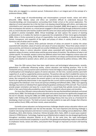 This document discusses emphasizing morals, values, ethics, and character education in science education. It argues that rapid advances in science and technology, as well as increased societal complexities, underline the importance of including these components in science education. The author examines challenges in teaching ethics and proposes developing a theoretical framework that draws upon both Western moral education philosophies and universal Islamic values to increase acceptability. A range of teaching techniques are suggested to foster ethics in students and develop skills needed for success in science.