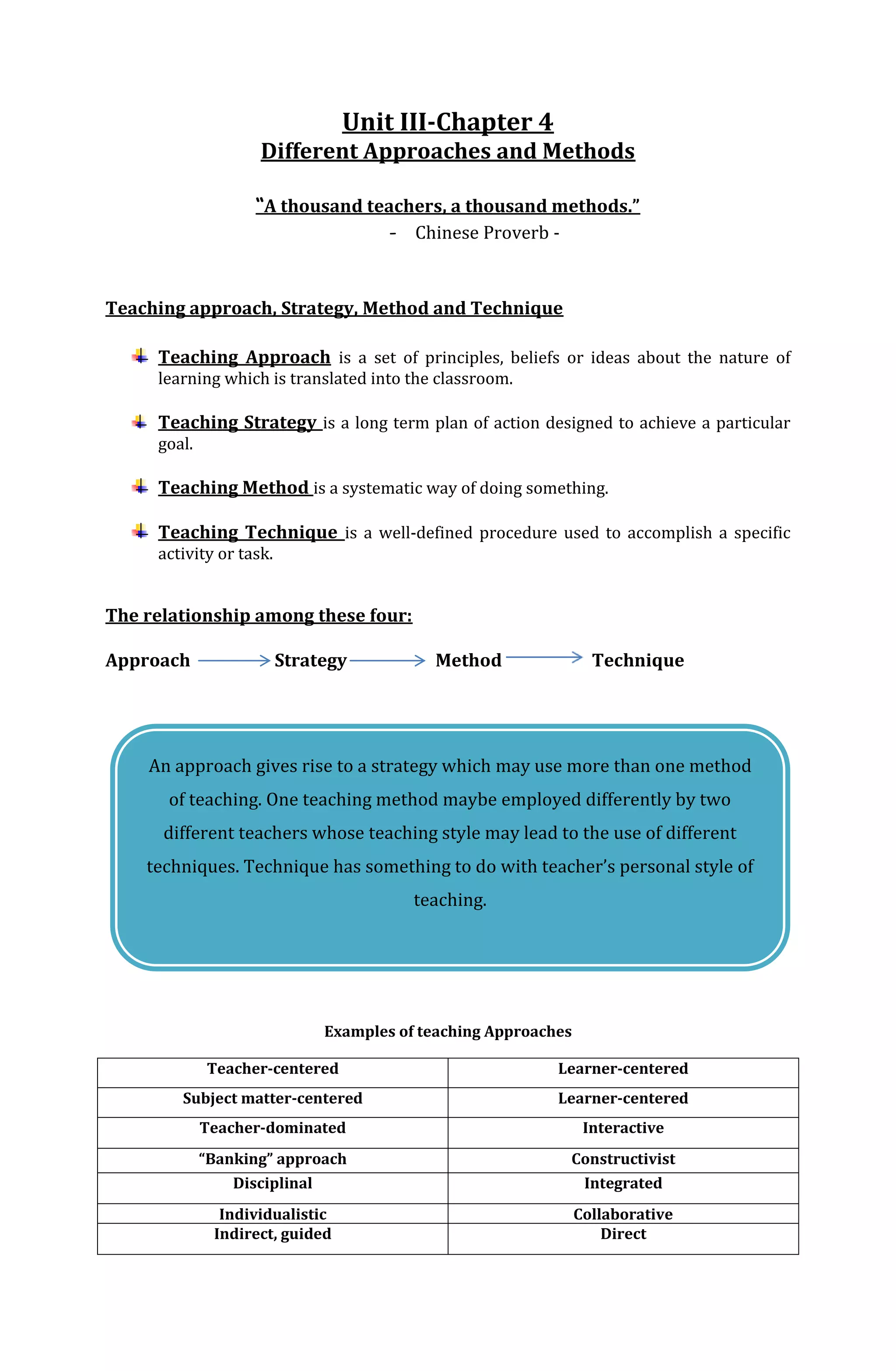 This document discusses different approaches and methods to teaching. It defines teaching approach, strategy, method, and technique, with approach being the broadest, informing strategies, and techniques being specific practices. Example approaches discussed include teacher-centered, learner-centered, and constructivist. Direct/expository approaches include lecture and demonstration, while indirect/guided approaches involve inquiry-based learning through methods like problem-solving and projects. Cooperative learning is also covered.