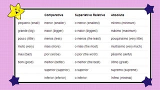 The document discusses comparatives and superlatives in Portuguese. It explains that comparatives can be used with adjectives, adverbs, and nouns to indicate equality, inferiority, or superiority. Superlatives can be relative or absolute, and indicate the highest degree of a quality. Relative superlatives compare an item to a set, while absolute superlatives intensify an adjective through adverbs or by adding suffixes. Special forms are used for certain comparative and superlative adjectives in Brazilian Portuguese.