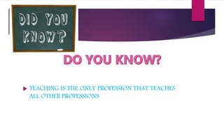 The document discusses the noble profession of teaching. It presents 20 questions for teachers to self-reflect on aspects like their passion for teaching, knowledge of the school's vision, punctuality, flexibility, preparation methods, and interest in students' futures. The document emphasizes that great teachers inspire students and act as role models who can positively influence students' development. It outlines challenges today's teachers face like peer pressure and urges teachers to be available as godly mentors to guide students like a potter shapes clay.