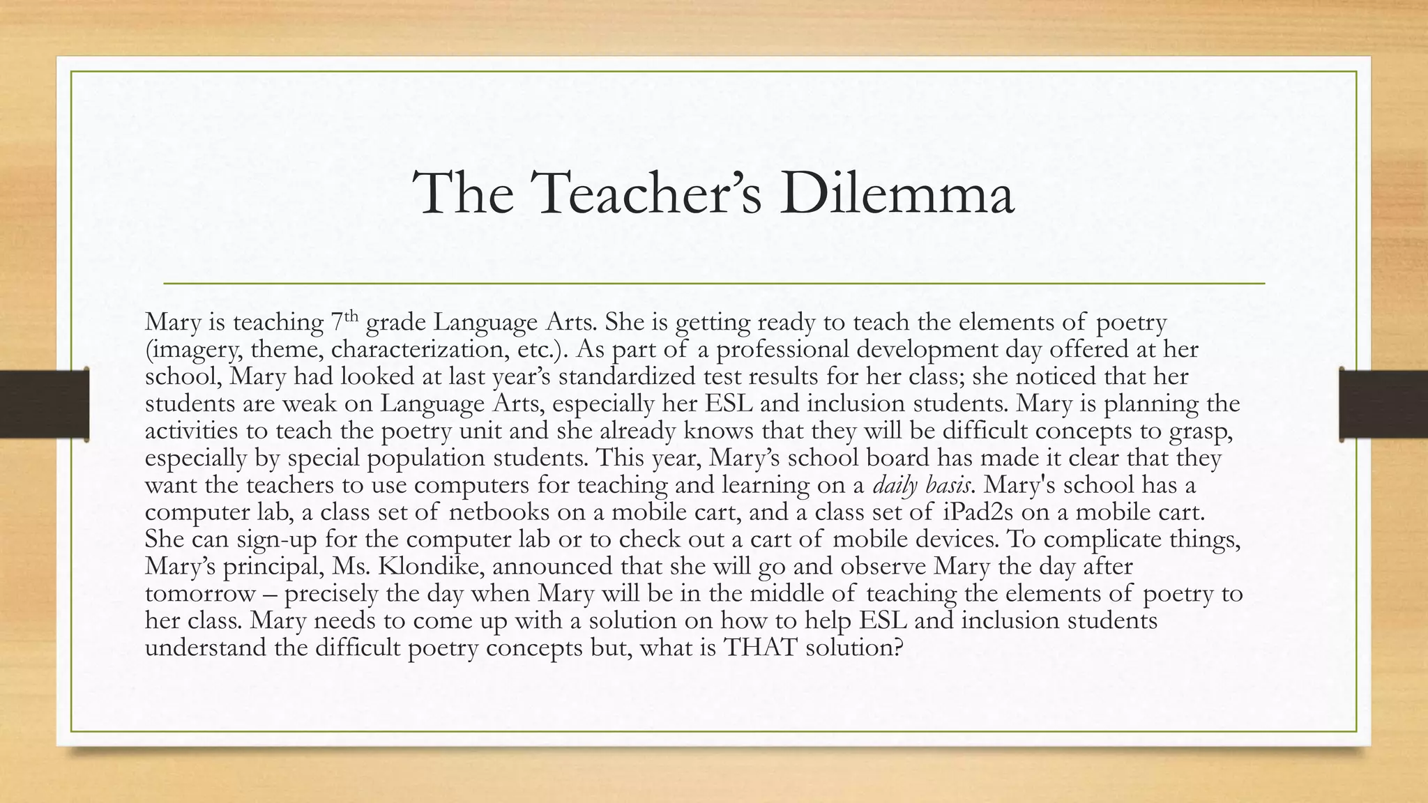 Mary, a 7th grade language arts teacher, is preparing to teach poetry elements while addressing the needs of her ESL and inclusion students, who have previously struggled with language arts. She plans to use technology, including a computer lab and mobile devices, to help students grasp difficult concepts like metaphor and alliteration. The lesson will involve group activities and personalized poetry selections, accommodating diverse language backgrounds.