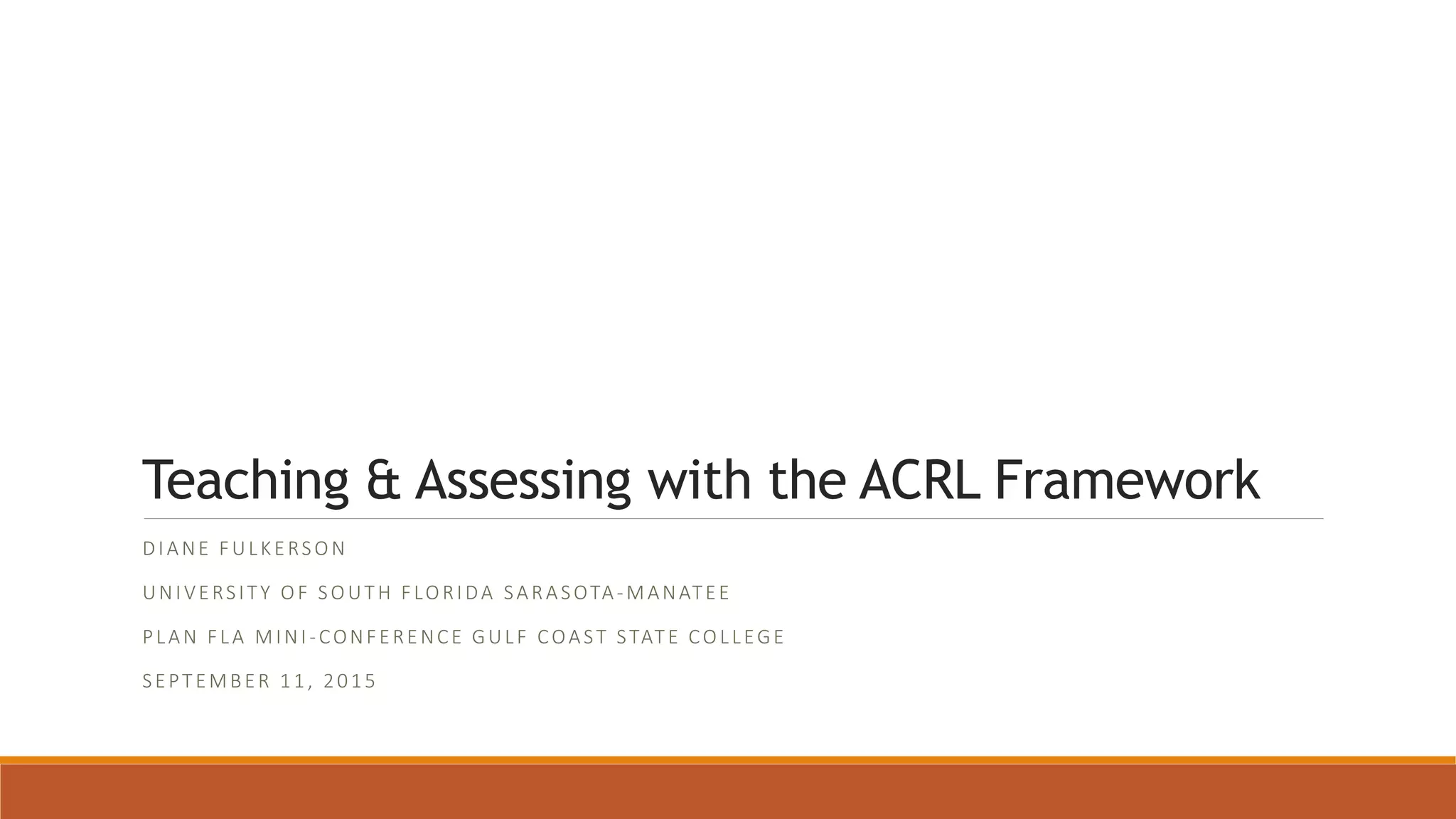 The document discusses teaching information literacy concepts using the ACRL Framework. It defines threshold concepts as transformative lessons that define a discipline. The framework can be used to design one-shot instruction sessions focused on essential questions and learning outcomes related to frames like authority, information creation and value. Assessment methods include class discussions, research logs and concept maps to evaluate if students understand framework concepts. Examples provided demonstrate how individual frames can be applied to an instruction session through big questions, outcomes and activities.