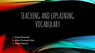 This document discusses various techniques for teaching vocabulary, including: - Using repetition and spaced practice to help with recall and generation of new words. Types of repetition mentioned include noticing, retrieval, and generation. - Helping learners comprehend word meanings by providing clear definitions, drawing attention to underlying meanings, giving repeated exposure, and avoiding interference from related words. - Spending focused time on individual words to help learners learn about their spoken and written forms, word parts, connections between concepts and referents, and placement in grammar and collocations.