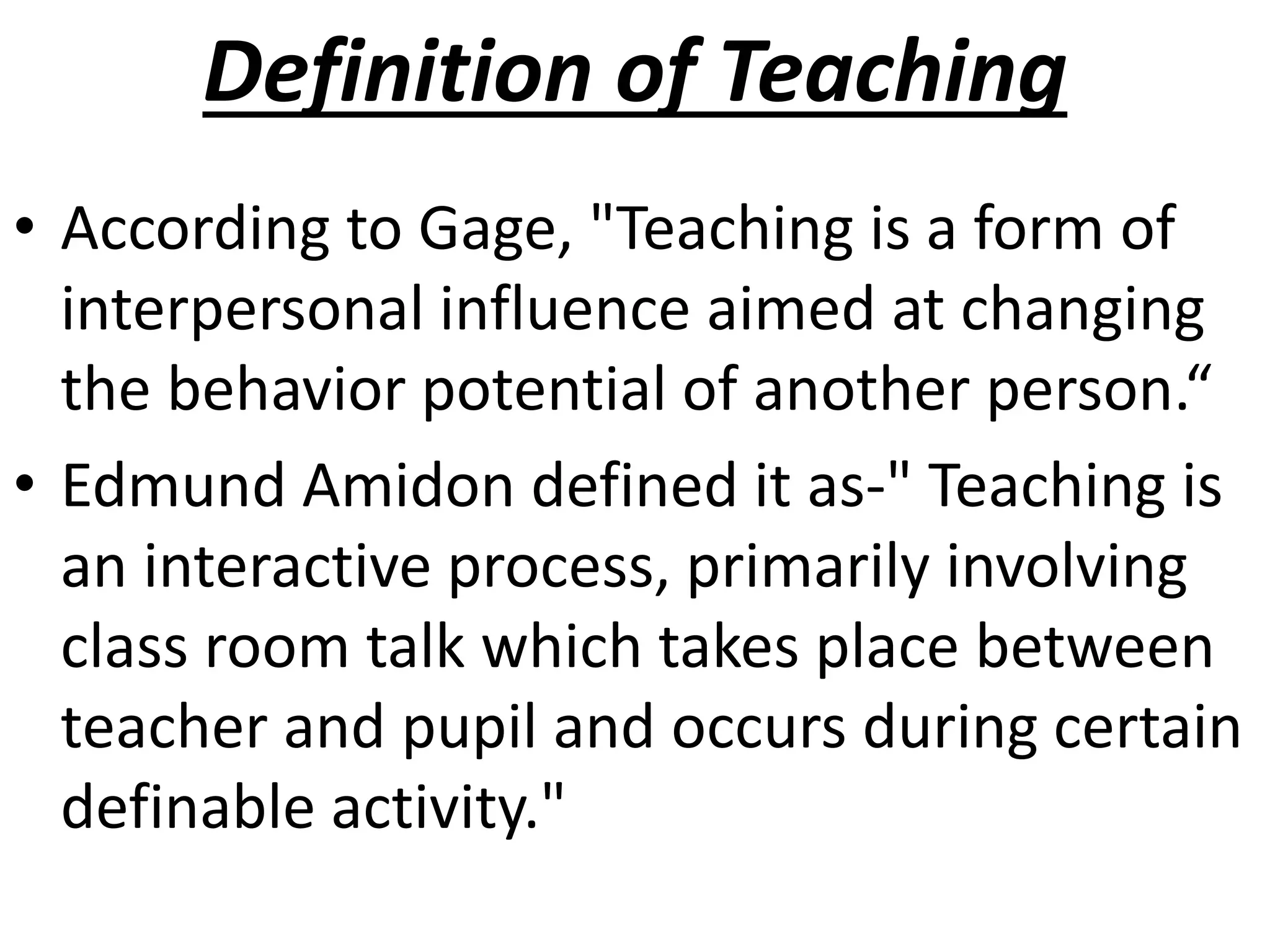 The document discusses definitions of teaching and effective teaching. Teaching is defined by several scholars as an interactive process aimed at influencing and changing another's behavior. Effective teaching is difficult to define as different styles can be equally effective. Principles of effective teaching include promoting student interest, concern for students, clear goals, intellectual challenge, and independence. Characteristics of an effective teacher include strong communication, cultural competence, assessment skills, technology integration, and subject matter expertise.