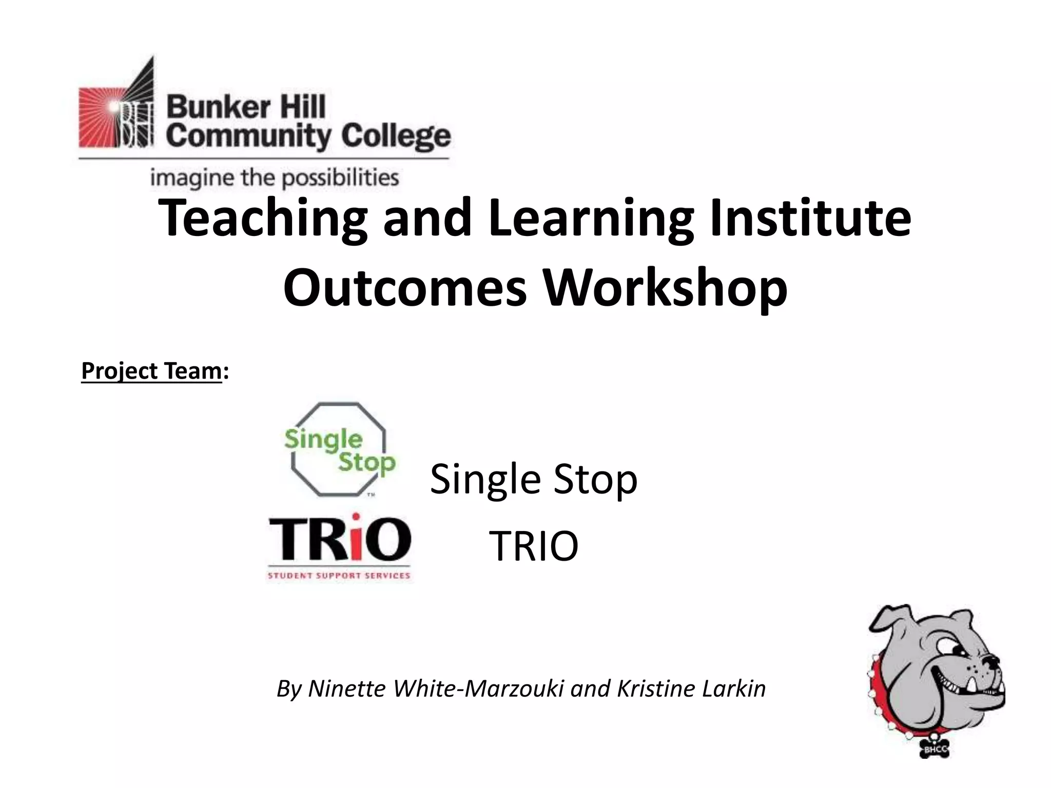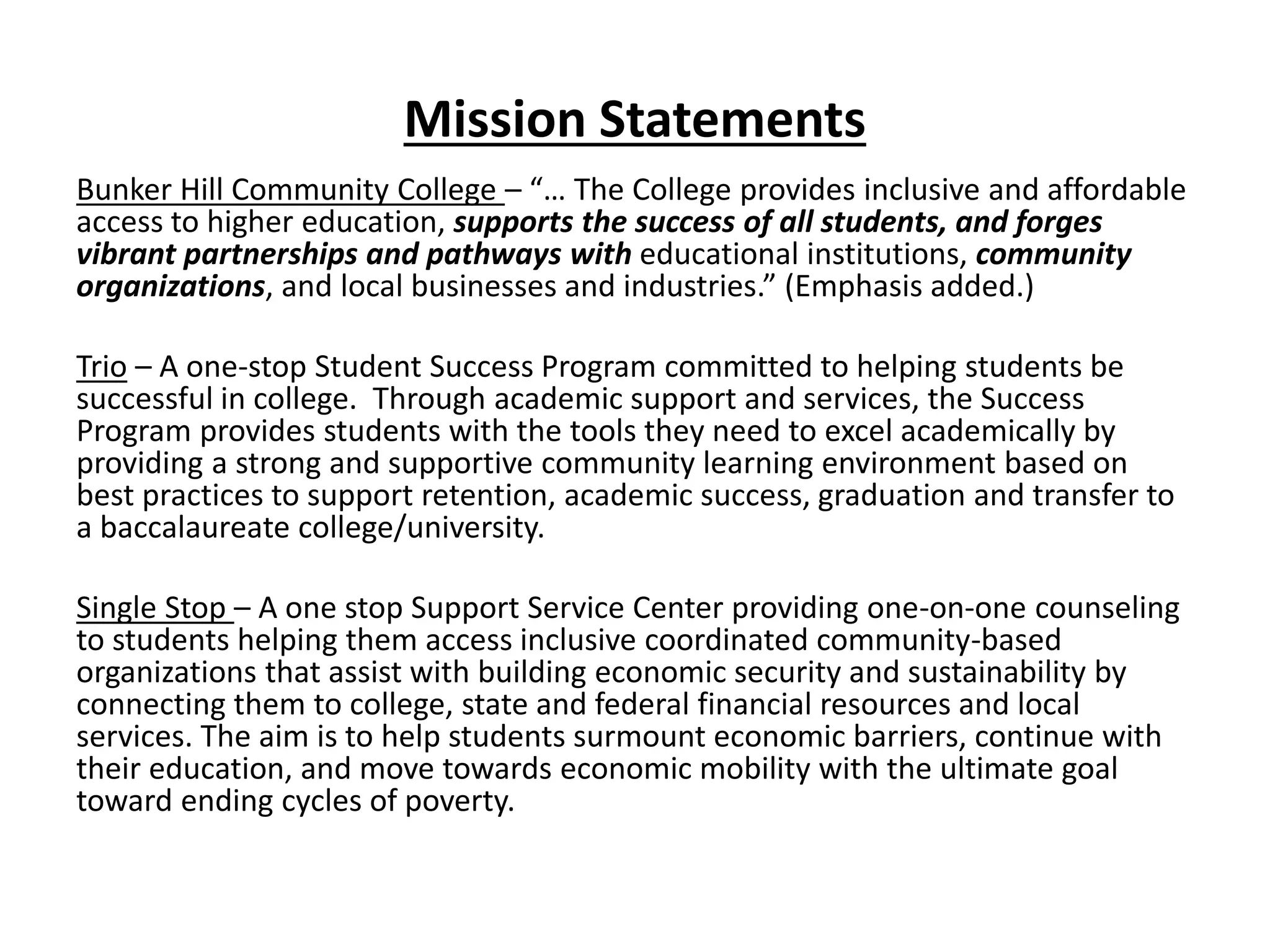The document outlines the mission and objectives of Bunker Hill Community College's TRIO and Single Stop programs, which aim to support students in overcoming barriers to education and achieving economic mobility. TRIO provides academic and transfer support services to students, while Single Stop connects them to essential community resources and financial assistance. Both programs emphasize collaboration, holistic support, and student self-advocacy to promote success and lifelong learning.