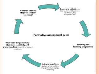 The document discusses evaluation in the teaching and learning process. It defines evaluation as making judgments based on criteria and evidence to examine the teaching and learning process. Evaluation is a systematic, continuous process to determine student growth toward curriculum objectives. There are different types of evaluation, including formative (ongoing), summative (final), diagnostic, criterion-referenced, and norm-referenced. Evaluation follows steps of planning, implementation, and analysis to improve instruction and assess student achievement of learning objectives.