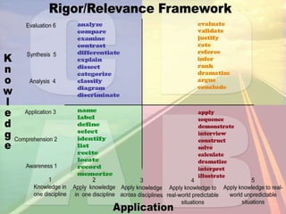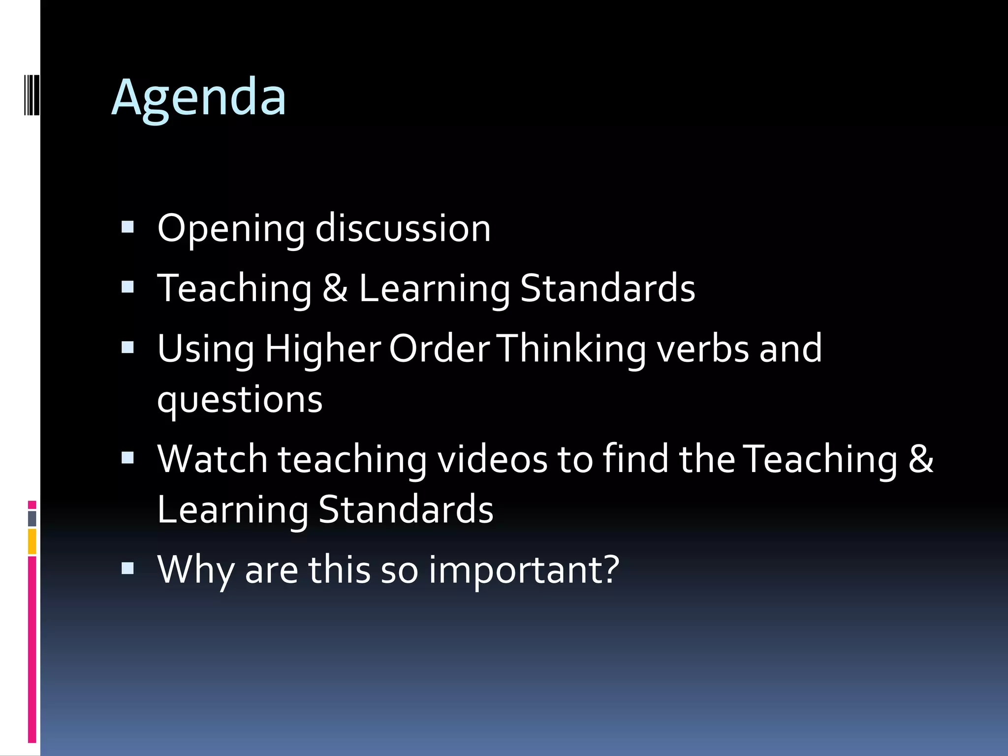 This document discusses teaching and learning standards. It begins with an anecdote from a professor who realized his students were memorizing rather than understanding. It then outlines the agenda, which includes discussing teaching and learning standards, higher order thinking, and analyzing teaching videos. The learning target is to evaluate the four standards of teaching and learning. These standards are then defined as higher order thinking, deep knowledge, substantive conversation, and connections to real world. A graphic organizer is created to explain each standard. The document concludes by explaining why teaching and learning standards are important through discussing rigor and relevance frameworks.