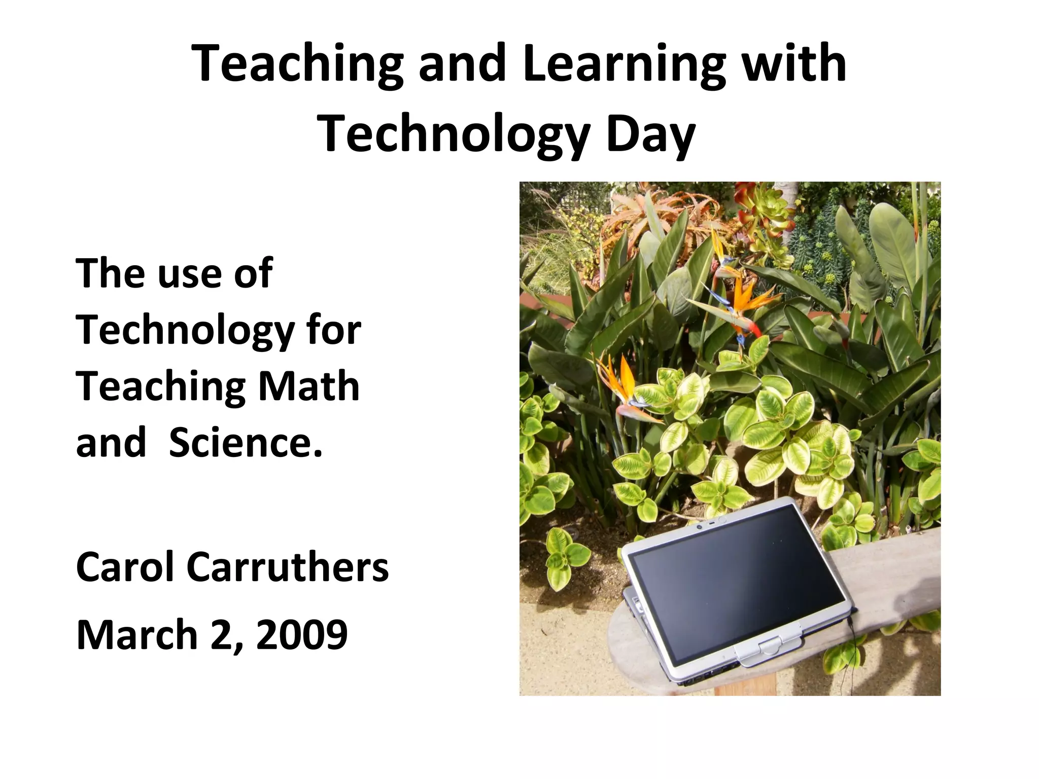 The document summarizes Carol Carruthers' presentation on March 2, 2009 about using technology for teaching math and science. It outlines various technologies that can be used like Math Type, overhead projectors, and Blackboard sites. It provides examples of online textbooks, interactive learning objects, and webquests. It also lists several favorite online learning resources and describes the instructor's use of tablet technology, faculty collaboration using Blackboard, and a Dyknow classroom.