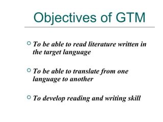 - The Grammar-Translation Method focuses on reading, writing, and translating skills. It emphasizes grammar rules and accuracy.