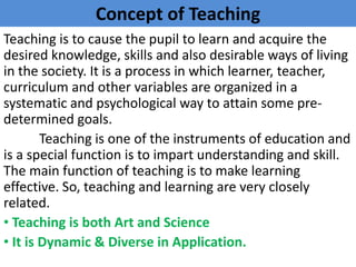 The document discusses the concept of teaching and learning, defining teaching as a process that involves systematic organization of learners, teachers, and curriculum to achieve educational goals. It outlines different viewpoints of teaching, including authoritarian, democratic, and laissez faire, and emphasizes the importance of effective teaching in facilitating learning. Additionally, the document explores learned concepts, characteristics of learning, types of learning, and Bloom's taxonomy, highlighting cognitive, affective, and psychomotor domains in educational psychology.