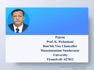 The document discusses the concept of profession and professionalism in the context of teacher education at Manonmaniam Sundaranar University. It highlights the importance of skills, ethical conduct, and continuing professional development for teachers, alongside the role of ICT in transforming teaching practices. Key factors affecting teacher development and the integration of technology in education are also addressed, emphasizing the necessity for quality management and professionalization in teacher education.
