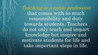 Teaching is a noble profession that requires significant responsibility towards students. Teachers do more than impart knowledge - they inspire and motivate students for life. They work to boost students' confidence and guide them in the right direction. Teaching performs an important social service by effecting positive change. It requires lengthy study and training to master subject content and teaching skills. Laws like the Continuing Professional Development Act and Philippine Teachers Professionalization Act were passed to continually improve teacher competence and strengthen teaching regulation. The Code of Ethics provides principles to guide teachers' proper behavior and establish their reputation as good role models.