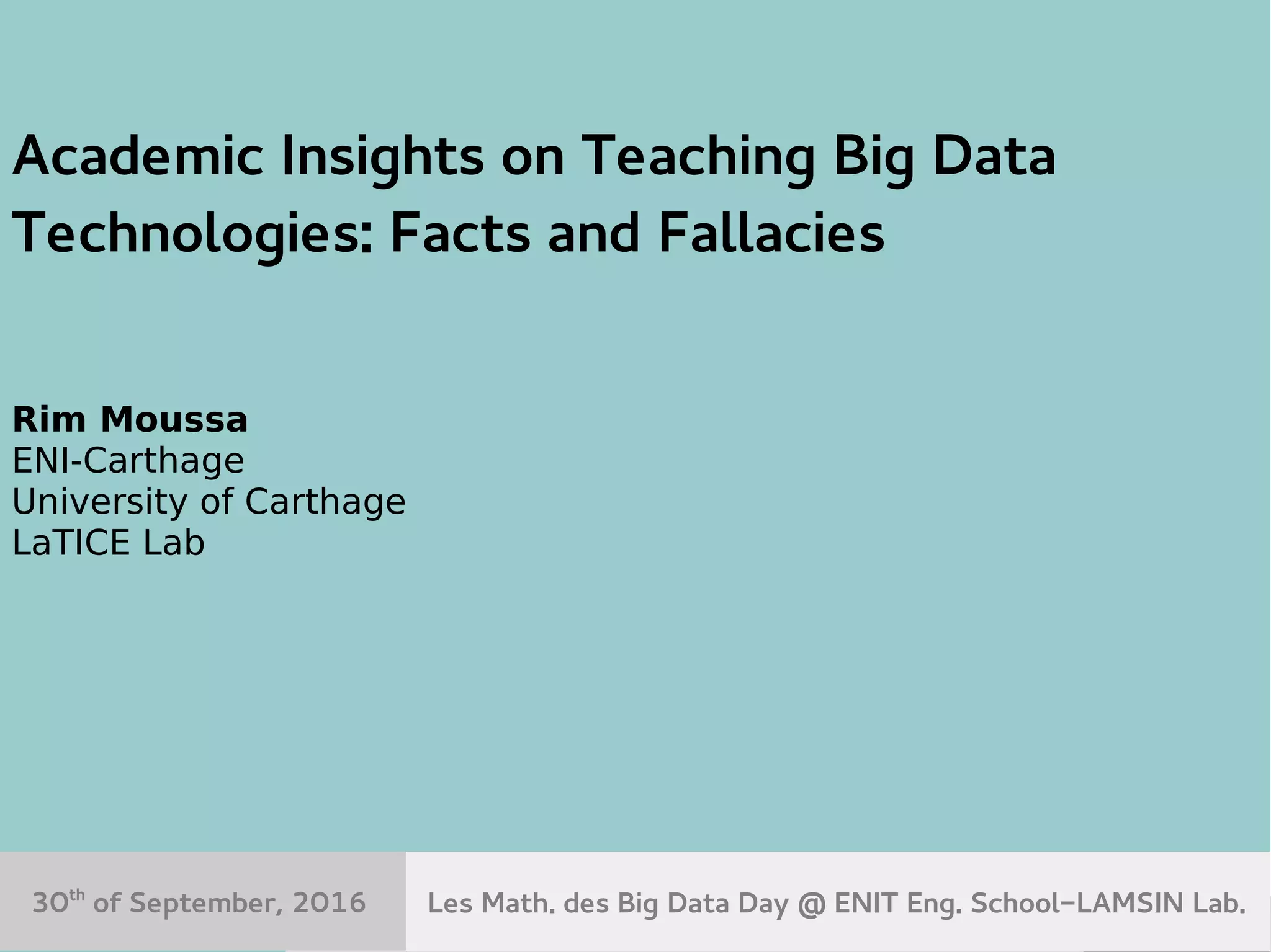 This document discusses teaching big data technologies and provides insights into facts and fallacies. It outlines big data technologies and scopes, including data management systems, data warehousing, machine learning, and infrastructure. It discusses goals of teaching big data for students, job markets, and nations. It provides facts about growing computer science enrollments and online learning platforms, and notes the French job market seeks skilled and senior profiles. The document recommends curriculum focus on theory, programming languages, and distributed systems before specialized big data technologies. It also discusses implementing high-performance computing in France and potential in Tunisia.